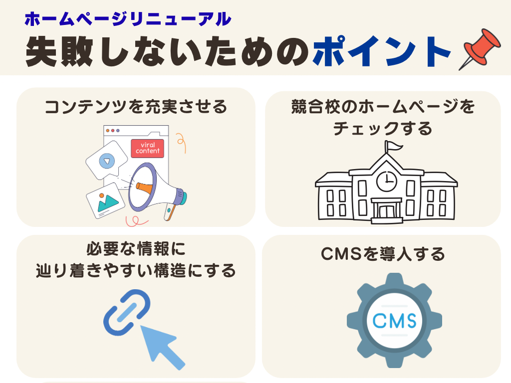 リニューアルの際に失敗しないためには、競合校のサイト分析やコンテンツの充実、ユーザーが求める情報へのアクセス性向上、CMSの導入が欠かせません。もちろんホームページはリニューアル後も継続的な情報発信や内容の更新を行いましょう。