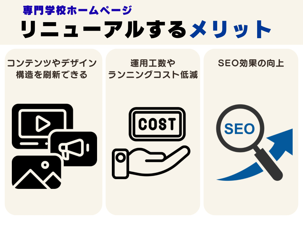 専門学校のホームページリニューアルは、学校の魅力を最大限に伝え、入学希望者の増加やブランドイメージの向上につながる重要な施策です。リニューアルのメリットとして、コンテンツやデザインの刷新、運用コストの削減、SEO効果の向上が挙げられます。