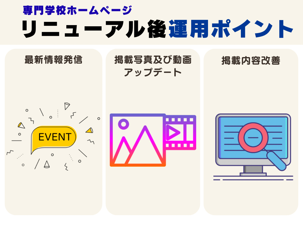 自校のホームページが開設されてから年月が経ち、古くなってしまっているというお悩みをお持ちの方、専門学校のホームページをリニューアルしたいというご担当の方もいらっしゃるのではないかと思います。