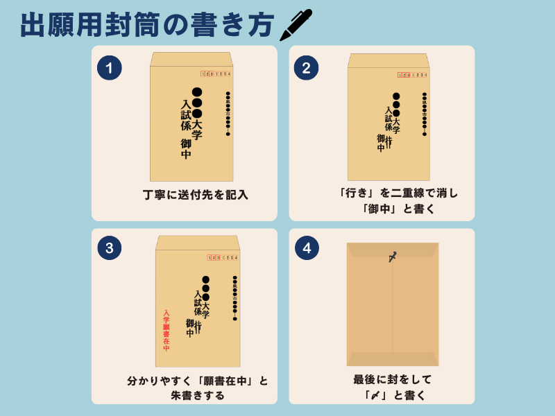 出願用封筒の書き方は、下記の手順で行いましょう。